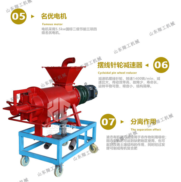該系列雞糞脫水機具有體積小、轉(zhuǎn)速低、操作簡單、安裝、維修方便、費用省、效率高、投資回收快,不需添加任何絮凝劑等特點;該機采用的螺旋軸、篩網(wǎng)為不銹鋼制作;禽畜類糞便處理機能將雞糞、牛糞、豬糞等禽畜糞便原糞水分離為液態(tài)有機肥和固態(tài)有機肥;液態(tài)有機肥可直接用于農(nóng)作物利用吸收;固態(tài)有機肥可運到缺肥地區(qū)使用,也可起到改觀土壤結構的作用,同時經(jīng)過處理可制成有機復合肥。